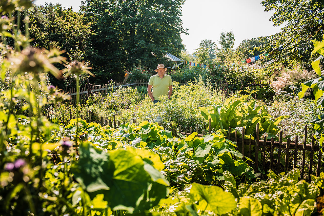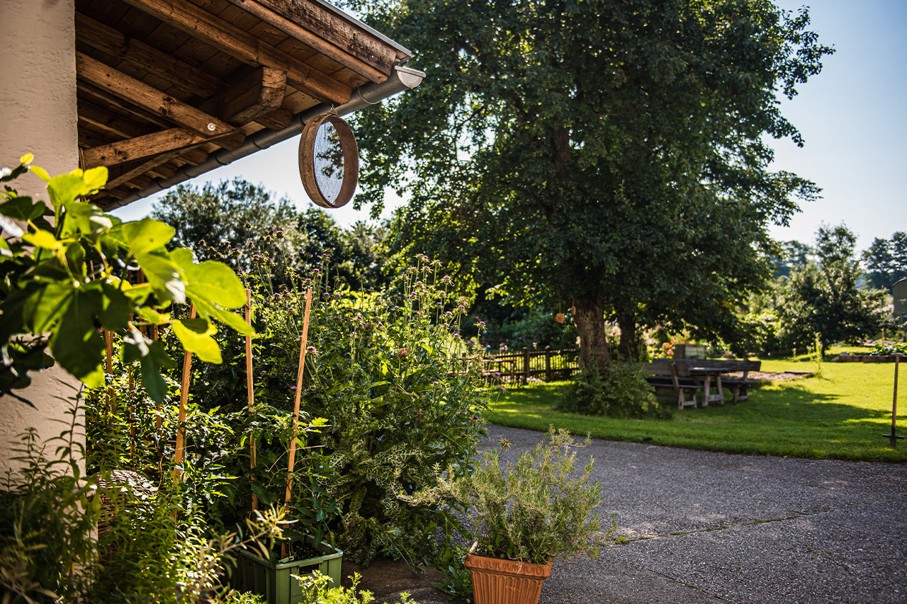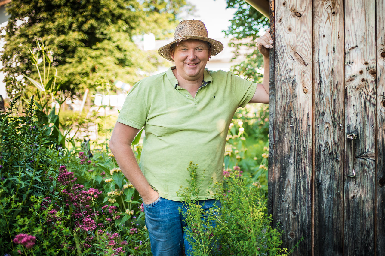 “Wir haben ja hier keine Viehhaltung, aber ich finde, zu einem Bauernhof gehören einfach auch Tiere.”, erklärt uns Hilarius, während er diese liebevoll krault. Natürlich interessiert uns auch der Kräutergarten, an dessen Zaun die nicht im Einsatz befindlichen Wabenrahmen der Hofbienen hängen. Hilarius geniesst hier in der Region den Ruf eines kompetenten Kräuterkundigen und bietet auch entsprechende Kurse an.