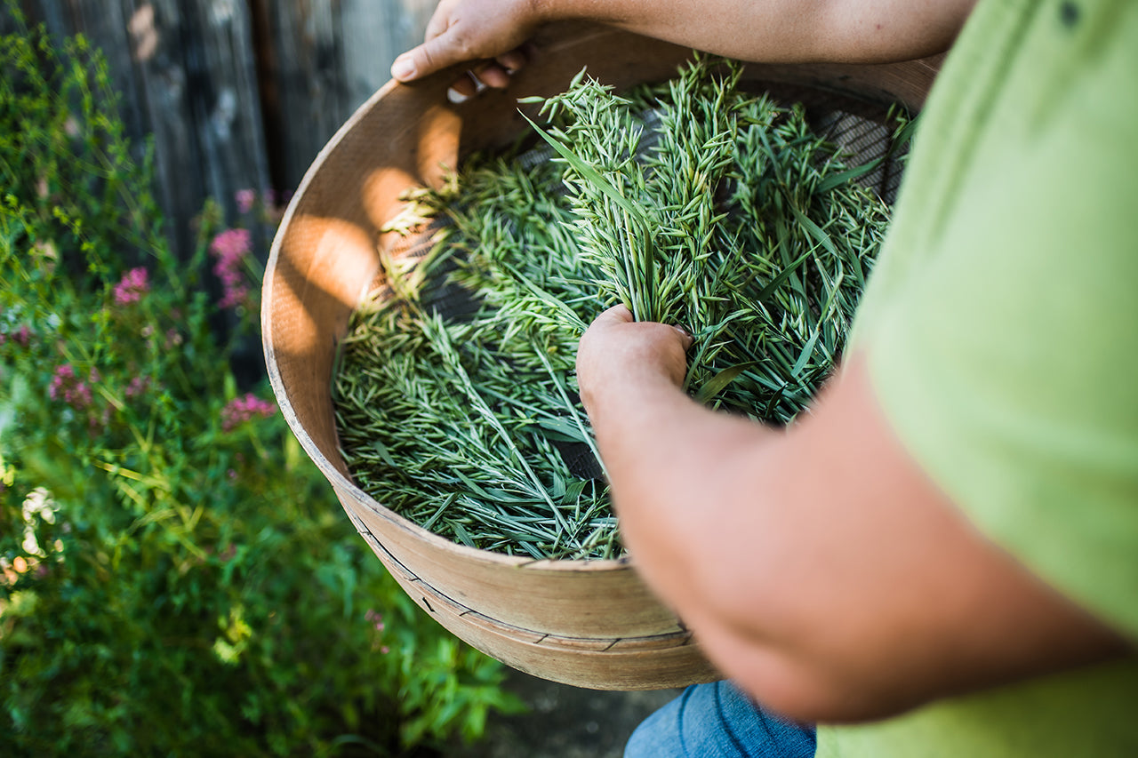 Natürlich möchten wir mit ihm die Felder besichtigen, auf denen das Barnhouse-Getreide wächst. Weil das Haferfeld einen kleinen Fußmarsch entfernt ist, beschränken wir uns auf das gleich benachbart liegende Dinkelfeld. Sattgrün leuchten die Halme, die schon um einiges höher stehen als der Hafer, erfolgte die Aussaat dieser alten Getreidesorte doch bereits im Herbst letzten Jahres. Überhaupt sind alte Getreidesorten und Kulturpflanzen Steckenpferd und Leidenschaft von Hilarius. Neben dem Dinkel wächst Emmer und Einkorn, aber auch Buchweizen, ein sogenanntes “Pseudogetreide”, dessen hochwertige Inhaltsstoffe gerade wiederentdeckt werden.